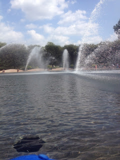 | Mommy and baby feet cooling off in the garden fountains on a scorching summer day! |